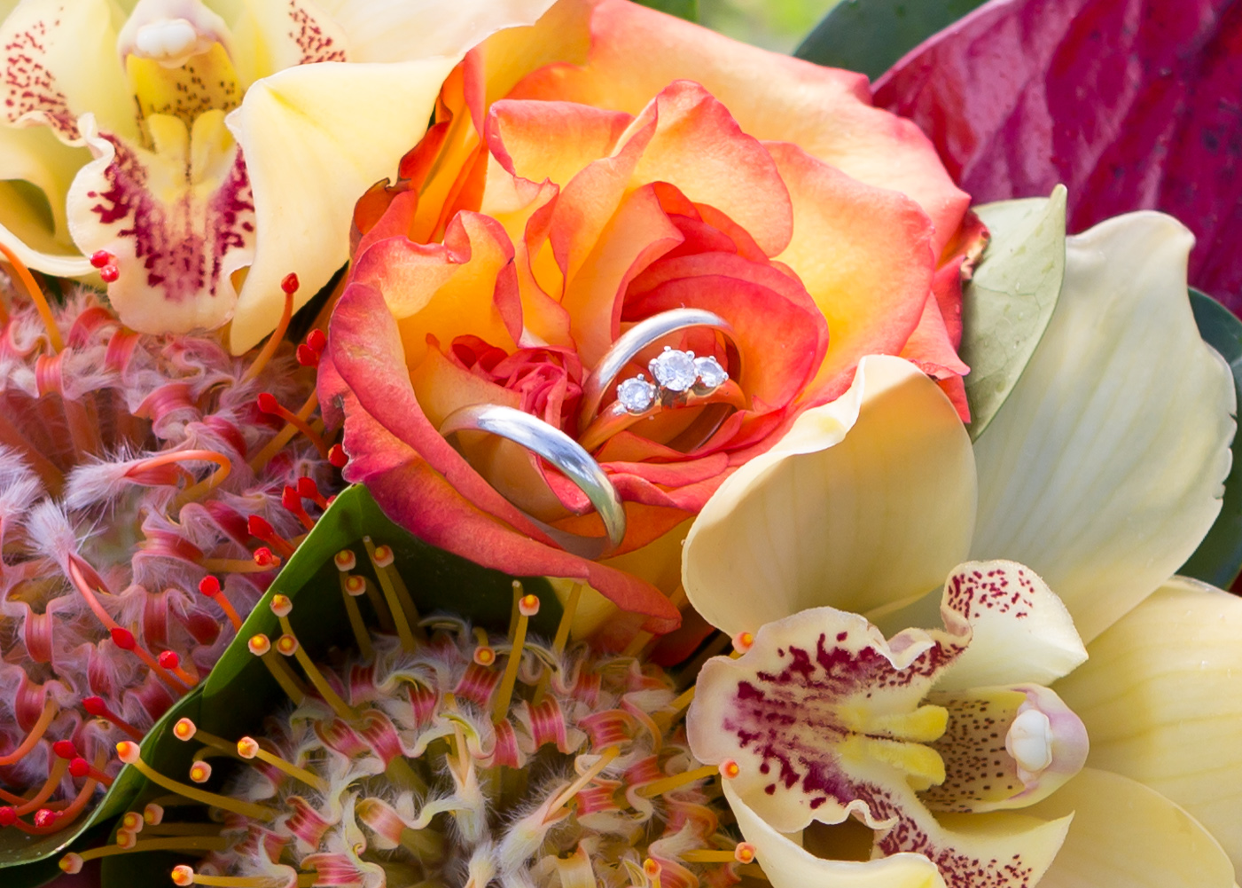 Orange paired with corals, yellows and bright pinks make a dramatic statement and really sets a beautiful framework for the coupe’s faces and pictures. They compliment a Maui beach wedding very nicely!